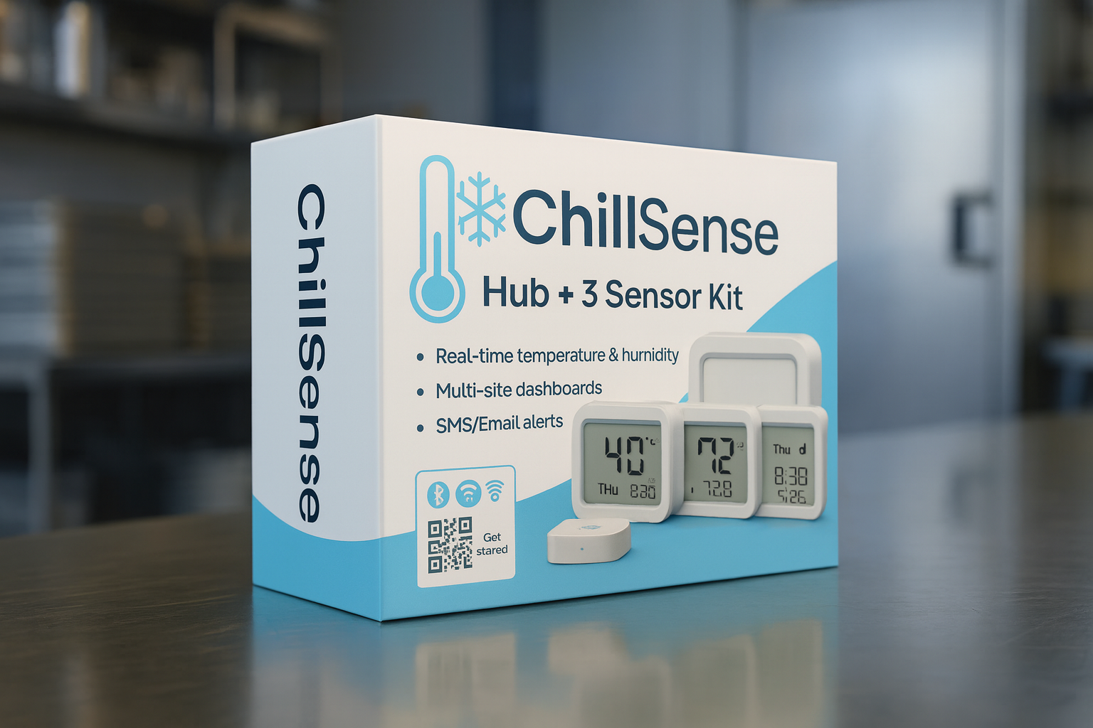 Everything you need to put your fridges, freezers and cool rooms online in minutes. The slim hub connects via Wi-Fi or Ethernet and auto-discovers the three BLE temperature-humidity sensors, streaming live data to an Australian-hosted dashboard.